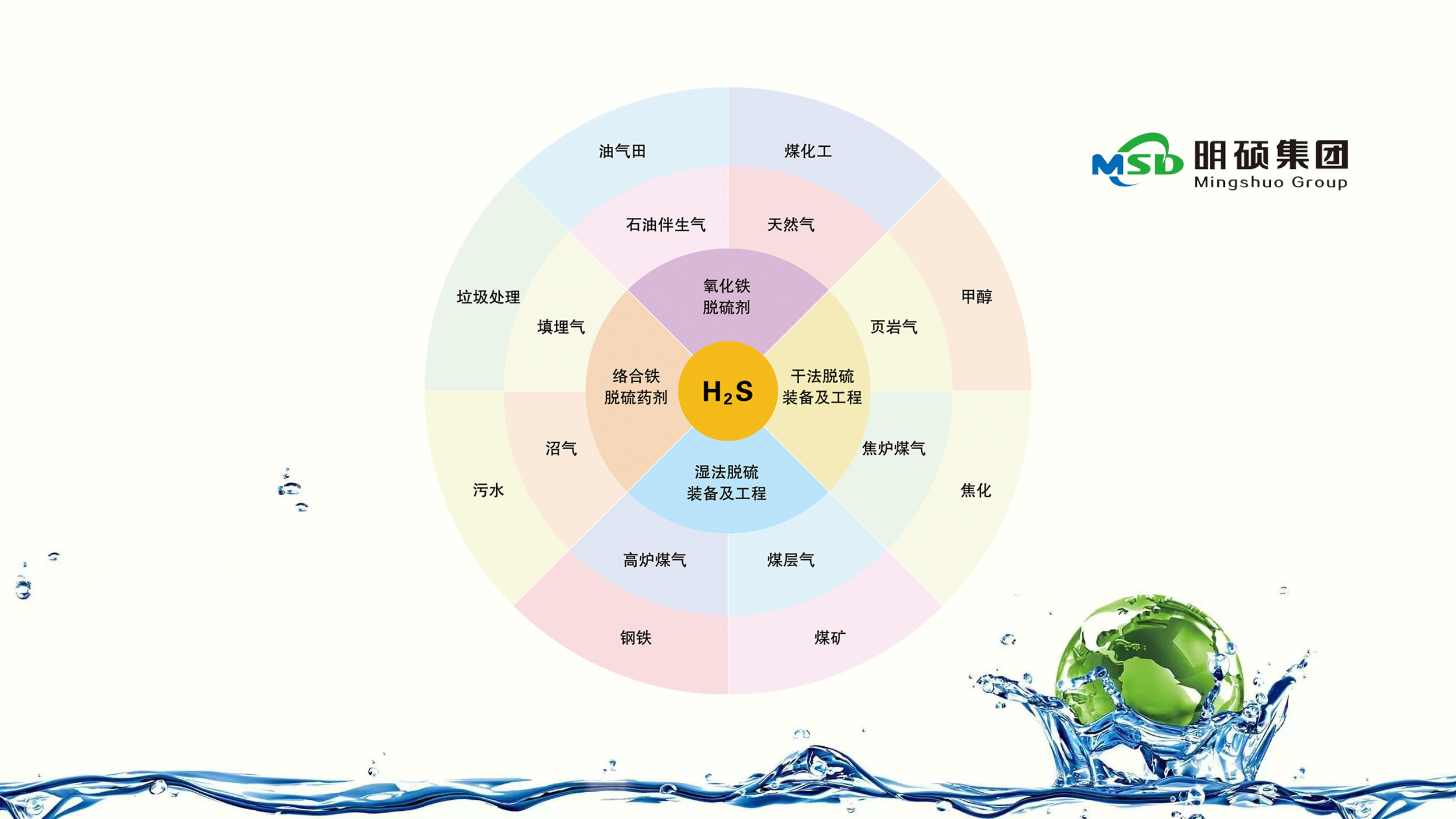 明硕产品分两大系列:脱硫药剂及脱硫装备,其中年产氧化铁系列脱硫剂20万吨。主要用于天然气、石油伴生气、煤层气、页岩高炉煤气、焦炉煤气、煤化工、沼气、石油炼化尾气等含硫气体的净化。明硕研发生产的羟基氧化铁脱硫剂,拥有多项自主发明专利,该系列脱硫剂具有脱硫精度高、反应速率快、使用周期长、运行成本低等特点,广泛应用于各行业含硫化氢气体的脱除。明硕研发的新式高效络合铁湿法脱硫装备,在正常工艺条件下脱硫效率达到99.99%,达到国际先进水平。 公司拥有自主进出口权,已为美国、加拿大、俄罗斯、德国、日本、中东及一带一路沿线国家逾千家客户提供了全套脱硫系统服务。